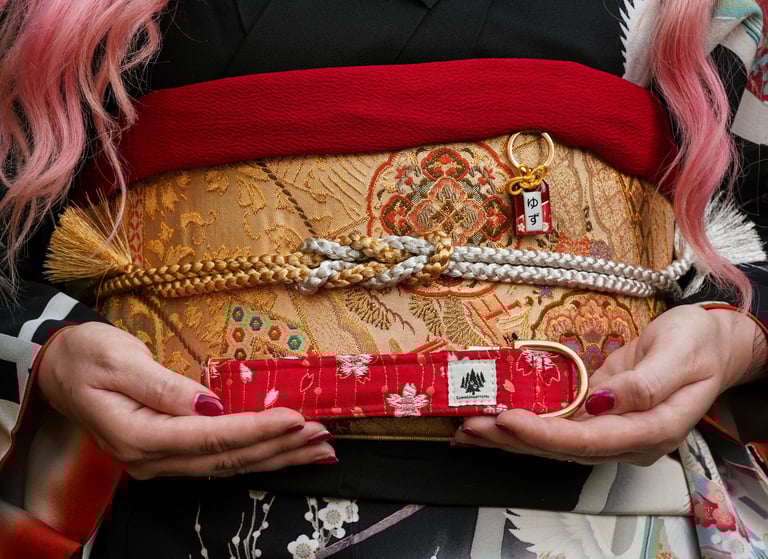 Unsere Luxuskollektion aus echtem, japanischen "Kinran", japanischem Goldbrokat, bei dem das Muster mit Goldfäden in den Stoff hinein gewebt wurde. Ein Stoff, aus welchem in Japan hochwertige "Obi" gefertigt werden – der kunstvoll gebundene Gürtel, der zum Kimono getragen wird.